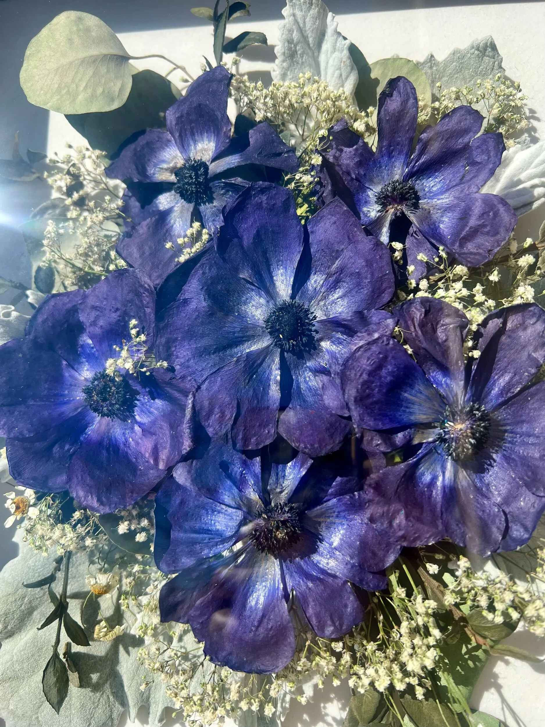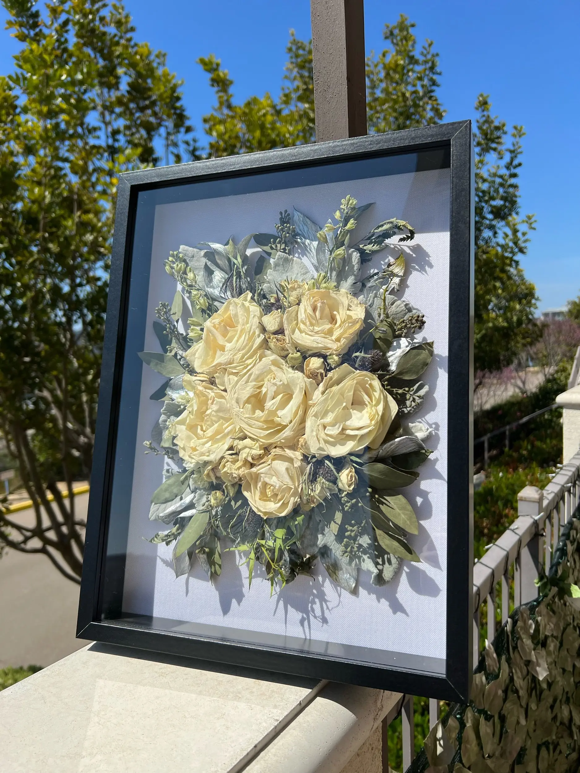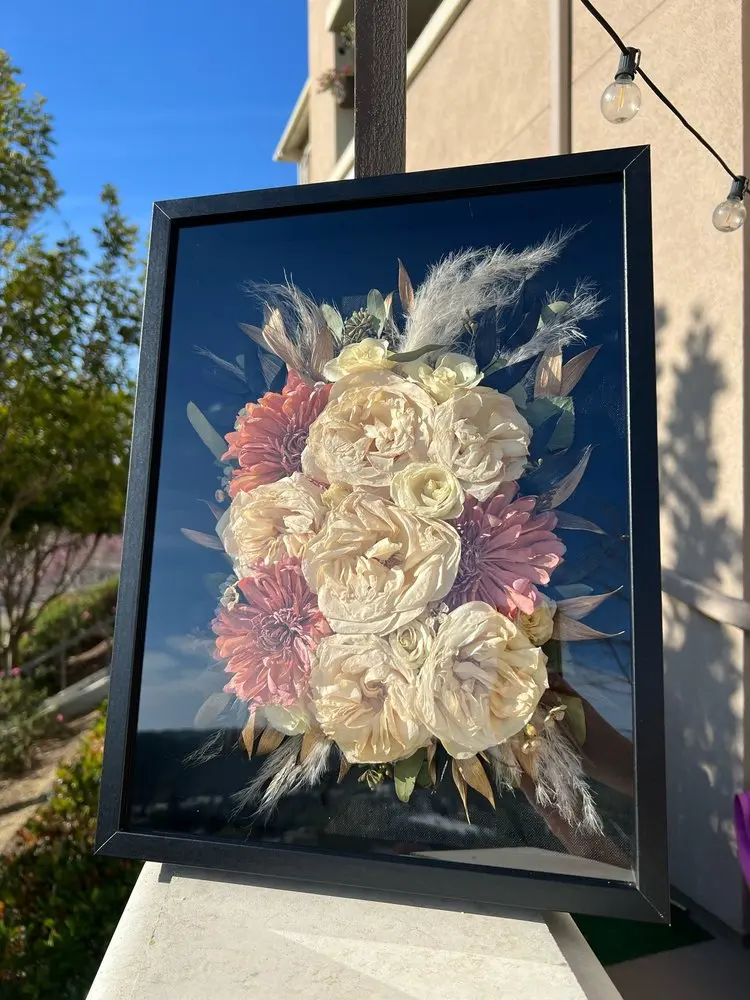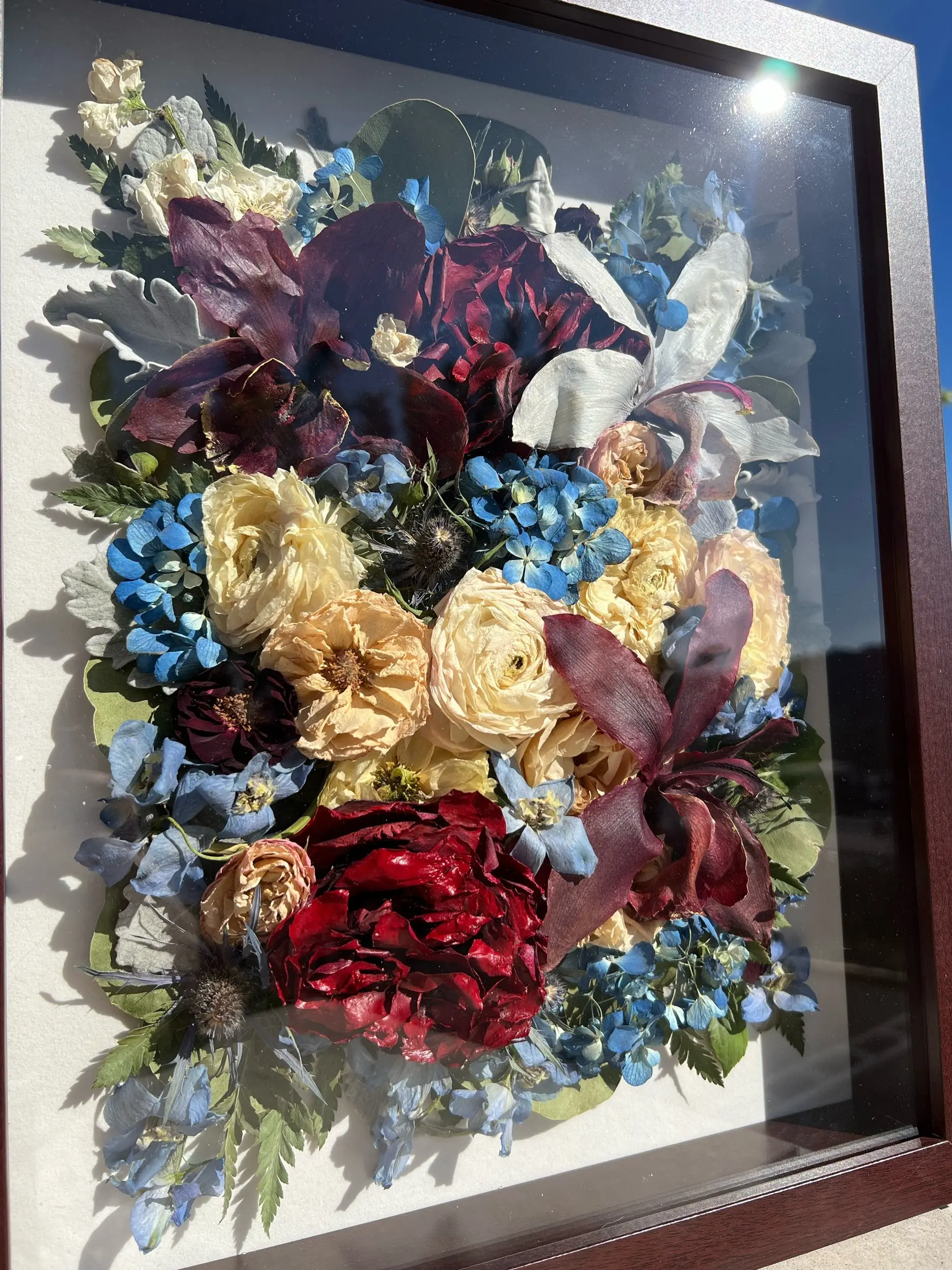 Your florals will be reimagined, kept as realistic as possible to the day of your event. Different tactics are used to keep their color and shape, as well as their resistance to the elements outside of a typical frame or resin. Treated with various techniques to proactively curb the affects of time on your flowers. Color enhancing included as needed.
